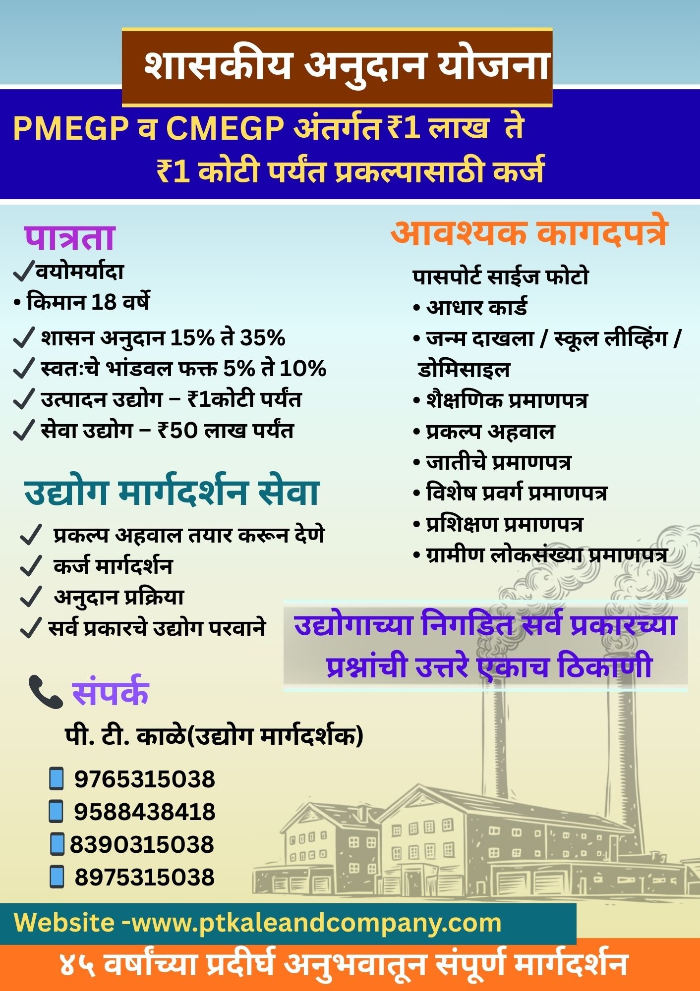 P T Kale & Company is a trusted name in Agricultural Subsidy Project Consultancy in Pune, Maharashtra. With more than 45 years of experience in industrial and agricultural project guidance, we help entrepreneurs, farmers, agro-industries, and startups to obtain government subsidies, bank loans, and project approvals for agriculture and food processing businesses. Our expert consultancy services guide clients through the complete process of project planning, subsidy application, documentation, and bank finance. We specialize in providing professional assistance for Agro Processing Projects, Food Processing Units, Cold Storage Projects, and Agriculture-based industries. Our Agricultural Subsidy Consultancy Services P T Kale & Company provides complete support for various government subsidy schemes for agriculture and agro industries: • Agriculture & Agro Processing Project Reports • Government Subsidy Guidance and Documentation • Bank Loan Project Reports • Food Processing Industry Projects • Cold Storage & Warehouse Projects • Fruit & Vegetable Processing Projects • Dairy, Poultry & Agro Based Industry Projects • MSME & Agro Industry Registration Guidance Our experienced team ensures that clients receive accurate project planning, financial feasibility reports, and professional support to maximize subsidy benefits.