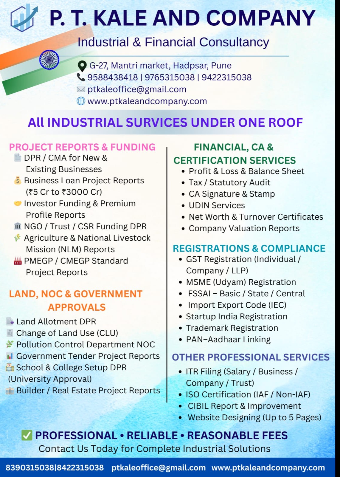 P. T. Kale & Company यांच्या माध्यमातून मिळवा उद्योग व वित्तीय सल्ला एकाच छताखाली. प्रोजेक्ट रिपोर्ट, बँक लोन फंडिंग, सरकारी योजना (PMEGP / CMEGP), GST, FSSAI, CA सेवा, नोंदणी व कंप्लायन्स, जमीन-NOC-सरकारी परवानग्या तसेच ISO, ITR, CIBIL व इतर व्यावसायिक सेवा — सर्व विश्वासार्ह व पारदर्शक पद्धतीने. 👤 मार्गदर्शक : P. T. Kale 📌 Industrial & Financial Consultant ✔️ Professional • Reliable • Reasonable Fees 📞 संपर्क : 9588438418 / 9765315038 / 9422315038/8390315038/8422315038