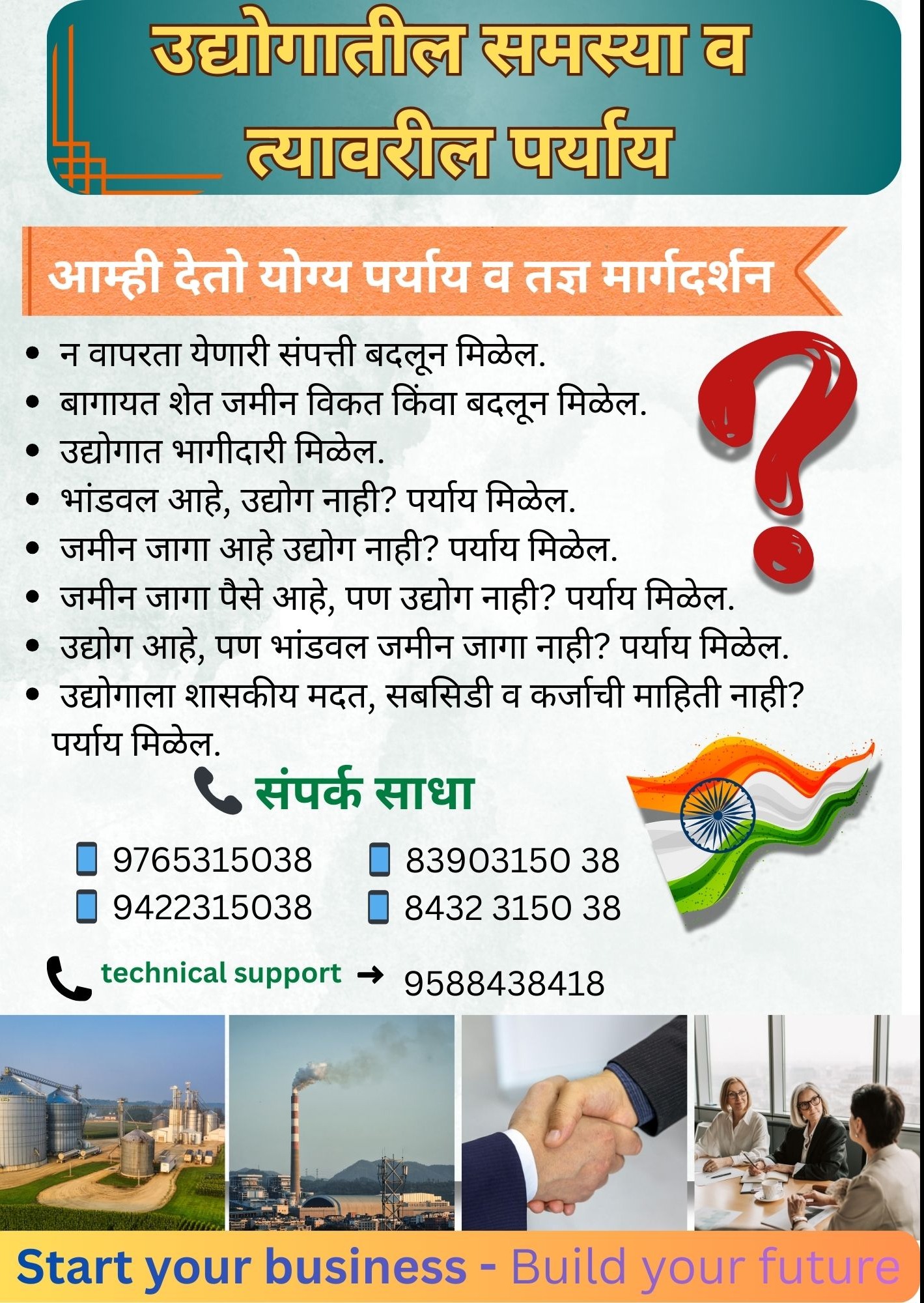जमीन, भांडवल किंवा साधनसंपत्ती असूनही योग्य उद्योगाचा मार्ग सापडत नसेल, तर उद्योग सुरू करण्यासाठी व वाढीसाठी उपाय व मार्गदर्शन मिळेल.P.T.Kale & Company Mantri Market, Hadapsar, Pune Contact Numbers: 9588438418, 9561765038, 9765315038, 8390315038, 8432315038
