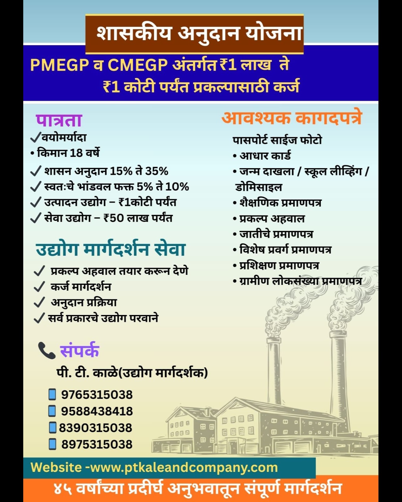 उद्योगाच्या निगडित सर्व प्रकारच्या प्रश्नांची उत्तरे एकाच ठिकाणी उद्योग व्यवसाय मार्गदर्शक 40 वर्षाचा पदीर्घ अनुभव पी टी काळे अँड कंपनी 9765315038, 9588438418, 8390315038, 8975315038