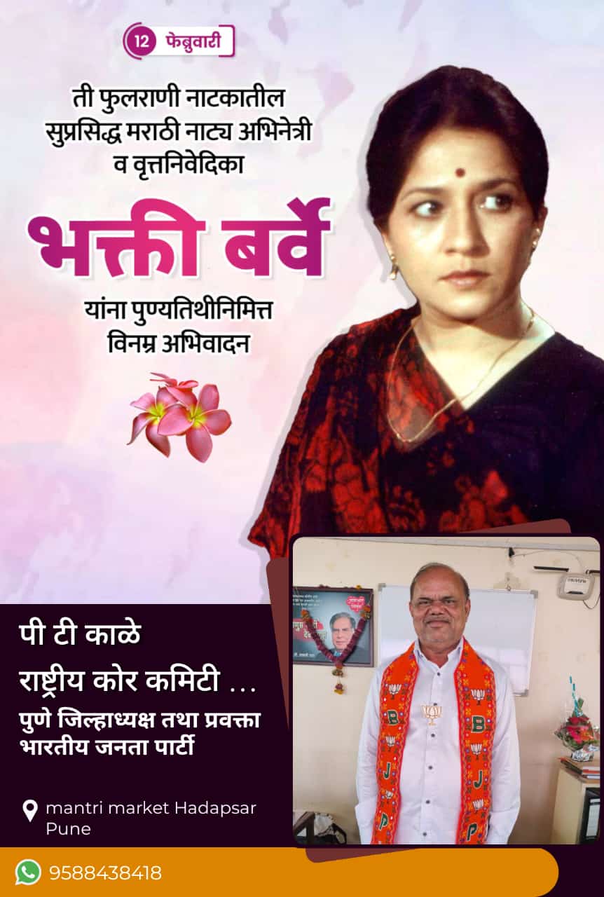 ती फुलराणी नाट्यातील सुप्रसिद्ध मराठी नाट्य अभिनेत्री व वृत्त निवेदिका भक्ती बर्वे यांना पुण्यतिथी निमित्त विनम्र अभिवादन पी टी काळे पुणे जिल्हा अध्यक्ष उद्योग आघाडी (राष्ट्रीय कोर कमिटी सदस्य kpm)