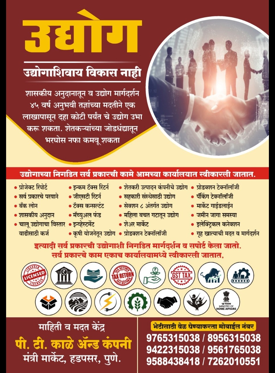 With the support of government subsidies, bank finance, and expert guidance backed by 45 years of experience, we help you establish and grow industries ranging from ₹1 lakh to ₹10 crore. From project reports and registrations to technology, market guidance, and compliance, we provide complete industrial support under one roof. P. T. Kale & Company Mantri Market, Hadapsar, Pune 📞 Contact Numbers: 9588438418 9561765038 9765315038 8390315038 8432315038
