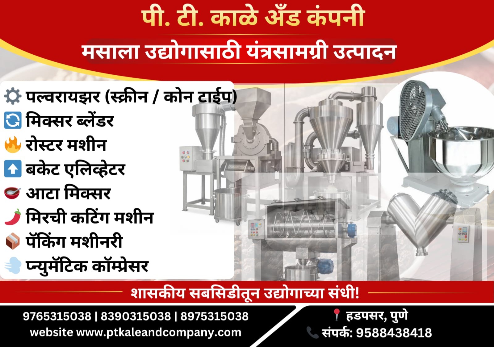 Spices Manufacturing Machine & Subsidy Consultant in Pune P T Kale & Company is a trusted name in Pune for providing complete guidance and consultancy for setting up spices manufacturing (masala) units under government subsidy schemes. We specialize in helping entrepreneurs, startups, and MSMEs establish profitable spice processing businesses with the right machinery, planning, and financial support. We offer end-to-end services including Detailed Project Report (DPR), machine selection, subsidy assistance, and bank loan support under popular government schemes like PMEGP, CMEGP, and PMFME. Our expert team ensures a smooth process from project planning to execution. Whether you are planning a small-scale home business or a large automatic spice plant, we help you choose the right machines such as pulverizers, grinders, mixers, and packaging units based on your budget and production capacity. Our goal is to help you start a successful spice business with maximum subsidy benefits and minimum risk. 👉 If you are looking for a reliable spices business consultant in Pune, P T Kale & Company is your one-stop solution for turning your business idea into reality. 🔑 SEO Keywords (optional use) Spices manufacturing consultant Pune, masala unit setup Pune, spice processing machine subsidy, PMEGP consultant Pune, CMEGP subsidy consultant, food processing consultant Pune, masala business setup India, spice plant project report, MSME subsidy consultant Pune