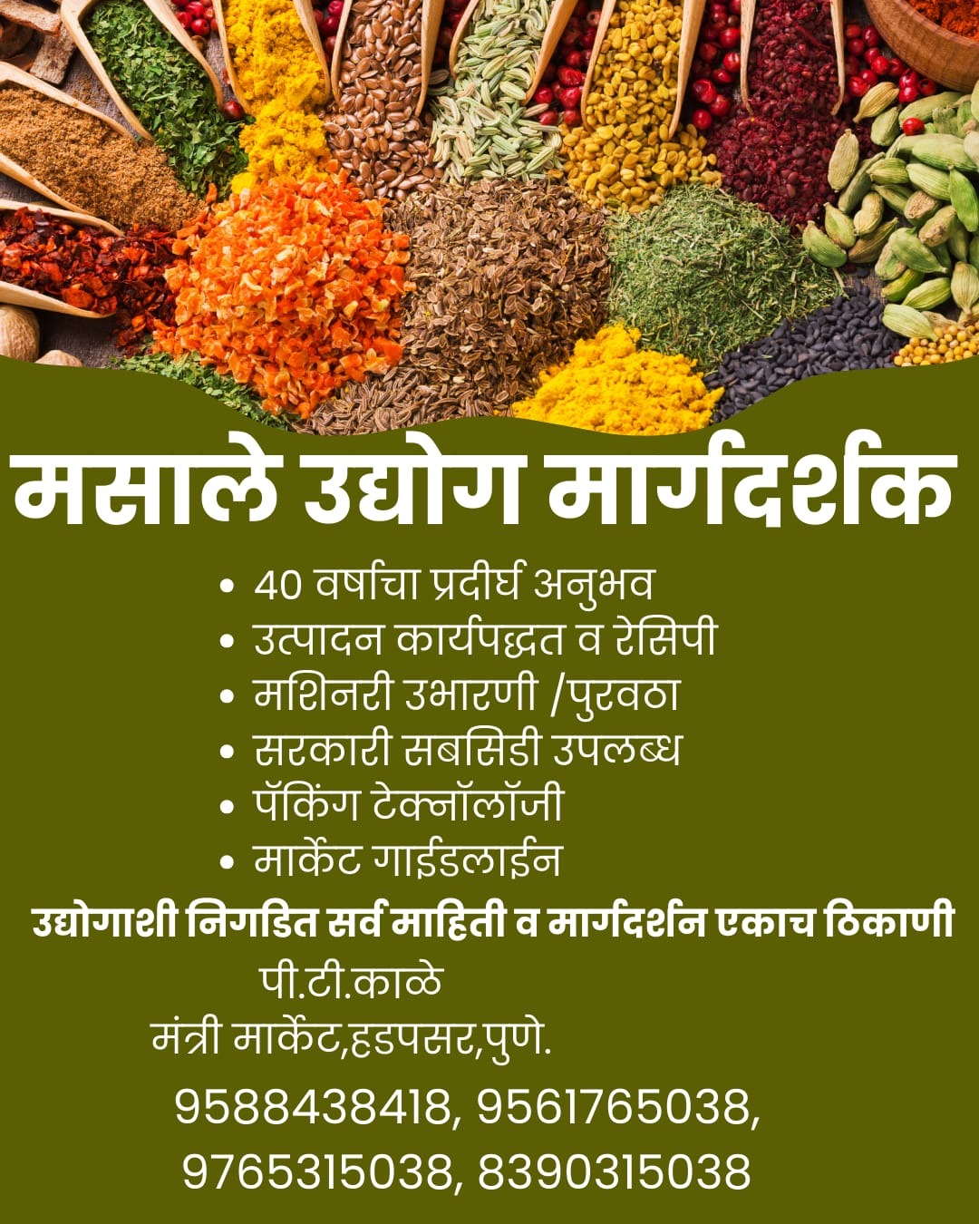 मसाले उद्योग सुरू करू इच्छिणाऱ्या उद्योजकांसाठी संपूर्ण व विश्वासार्ह मार्गदर्शन. कच्चा माल निवड, रेसिपी, उत्पादन प्रक्रिया, मशिनरी उभारणी, शासकीय सबसिडी, पॅकिंग व मार्केट गाईडलाईनपर्यंत सर्व सेवा एकाच ठिकाणी उपलब्ध. ४० वर्षांचा प्रत्यक्ष अनुभव असलेले पी. टी. काळे – मसाले उद्योग मार्गदर्शक उद्योग यशस्वी करण्यासाठी योग्य दिशा देणारे विश्वासार्ह सल्लागार. 📞 संपर्क: 9588438418 / 9765315038 / 8390315038 / 8432315038